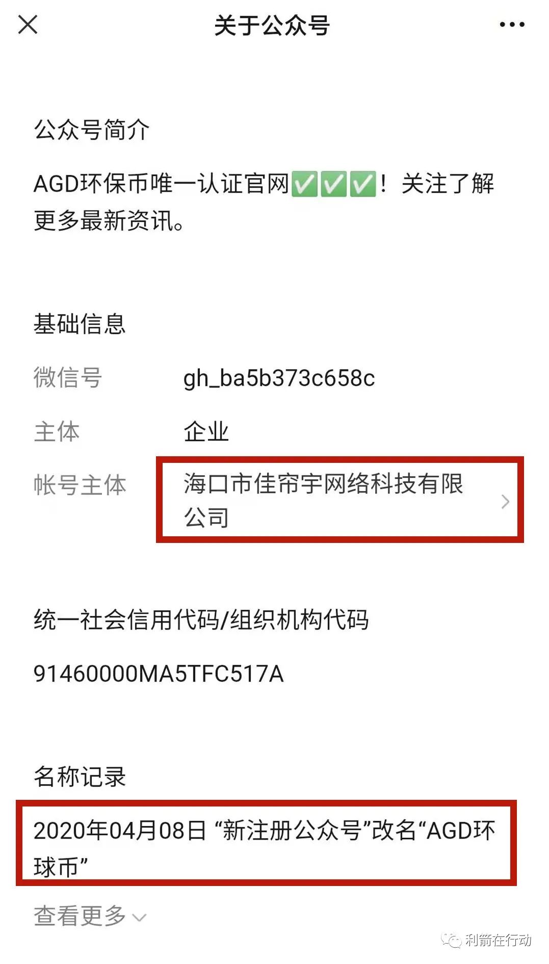 这个公众号注册的时间是2020年4月7日,4月8日改名为:AGD环球币